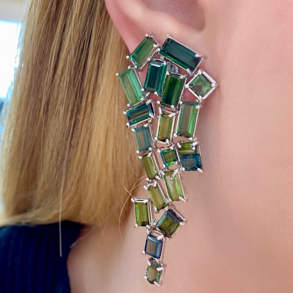 • Brinco em Ouro Branco 18Kt com Turmalinas Verde, Medida:6,5Cm - Peso:23,10Gr
