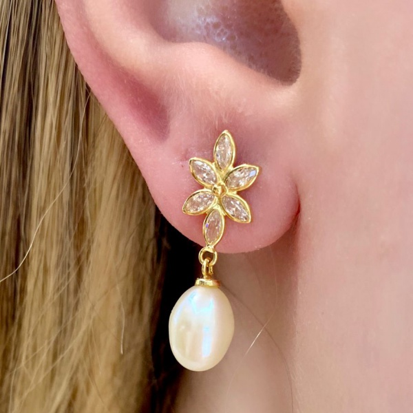 • Delicado Brinco em Ouro Amarelo 18Kt Com Safiras Branca e Pérola, Medindo: 2,20Cm de Comprimento  - Peso:2,40Gr