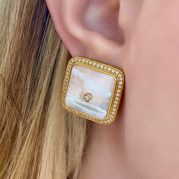 • Brinco em Ouro Amarelo 18Kt com Madre perola, todo rodeado de brilhantinhos e Um Brilhante central, Medida:2,20 x2,20cm, Peso:15,70Gr - Sistema de Pressão