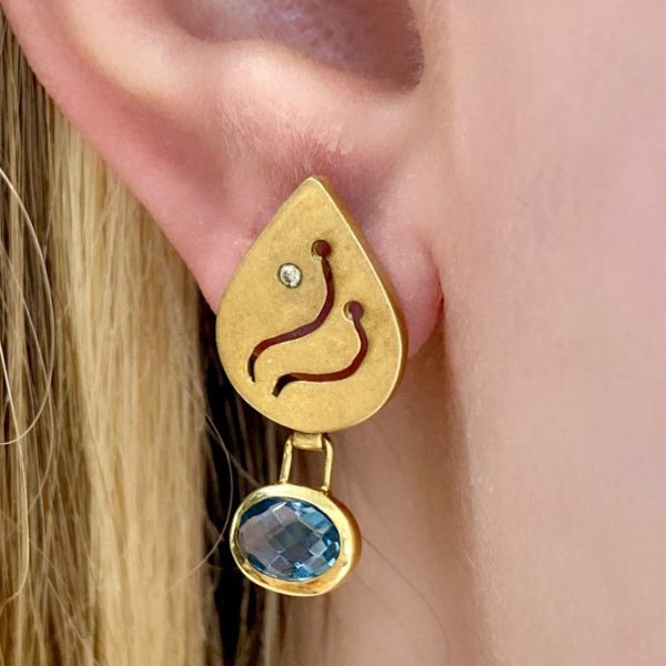 • Brinco Folha em Ouro Amarelo 18Kt Com Brilhantinhos e Topázio Azul - Medindo:2,50Cm de comprimento - Peso:5,0Gr